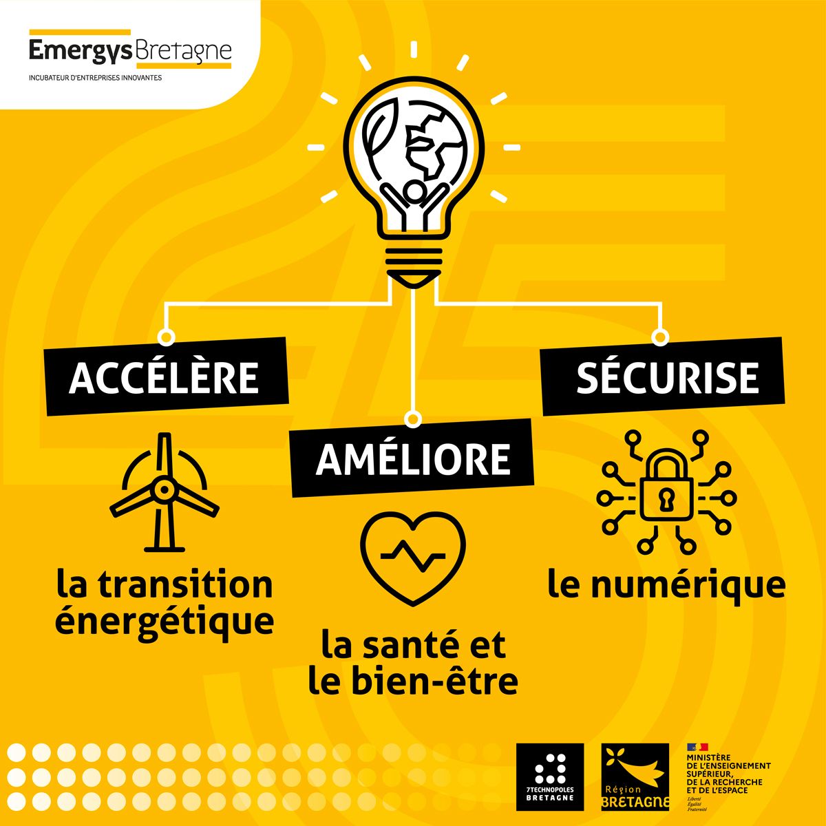 En 2025, l’incubateur régional a fêté ses 25 ans. Soutenu par la Région et l’État, en lien avec la recherche publique, Emergys Bretagne est géré par la fédération des 7 Technopoles Bretagne, dont fait partie le Technopôle Brest-Iroise. Emergys Bretagne propose un accompagnement de proximité, l’accès à un réseau d’experts, de financeurs et de partenaires, et la possibilité de suivre des formations tout au long de l’année.